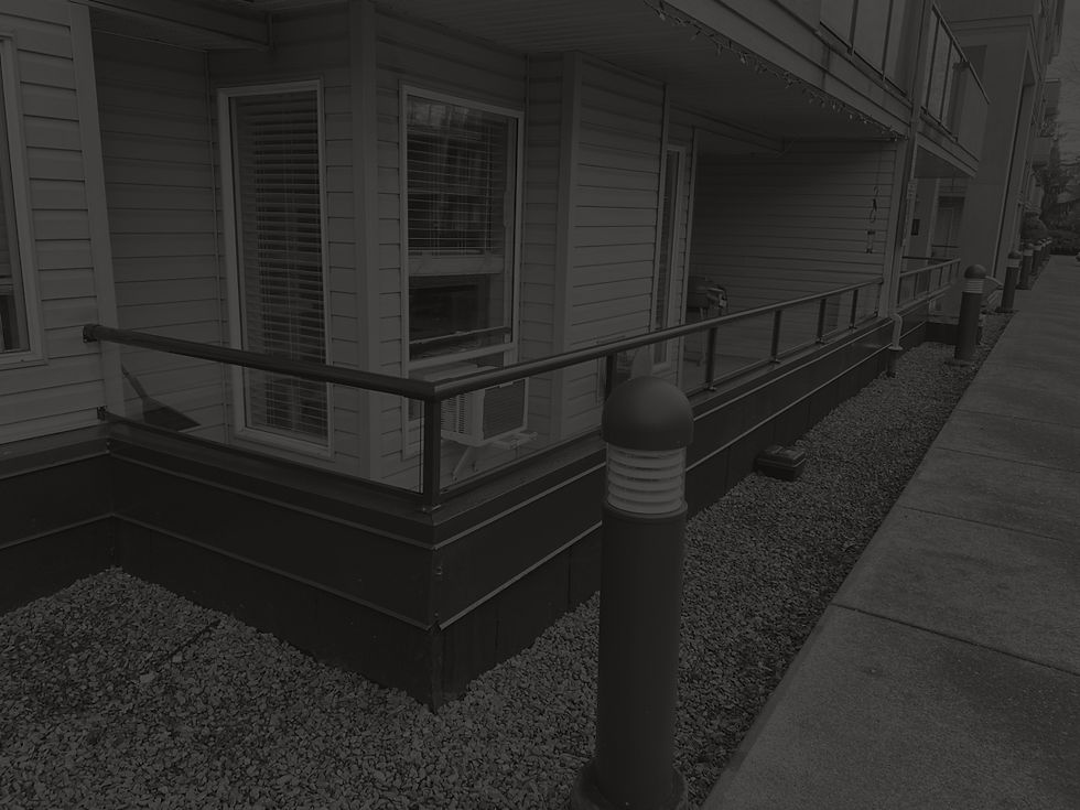 Full structural and exterior repair to a building following a vehicle impact, covering concrete wall rebuild, waterproofing, vinyl deck membrane, siding and flashing, stucco, window glass replacement, and new aluminum railing — restoring the building envelope to pre-loss condition.